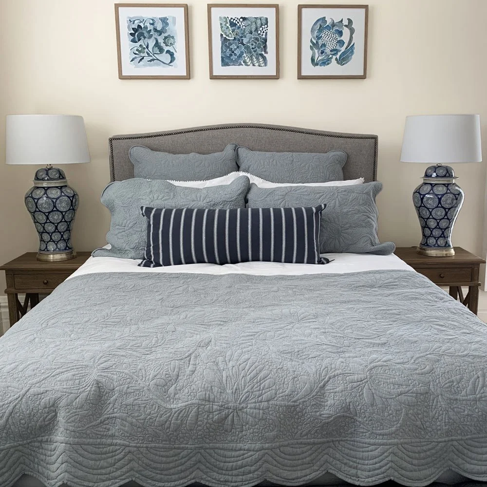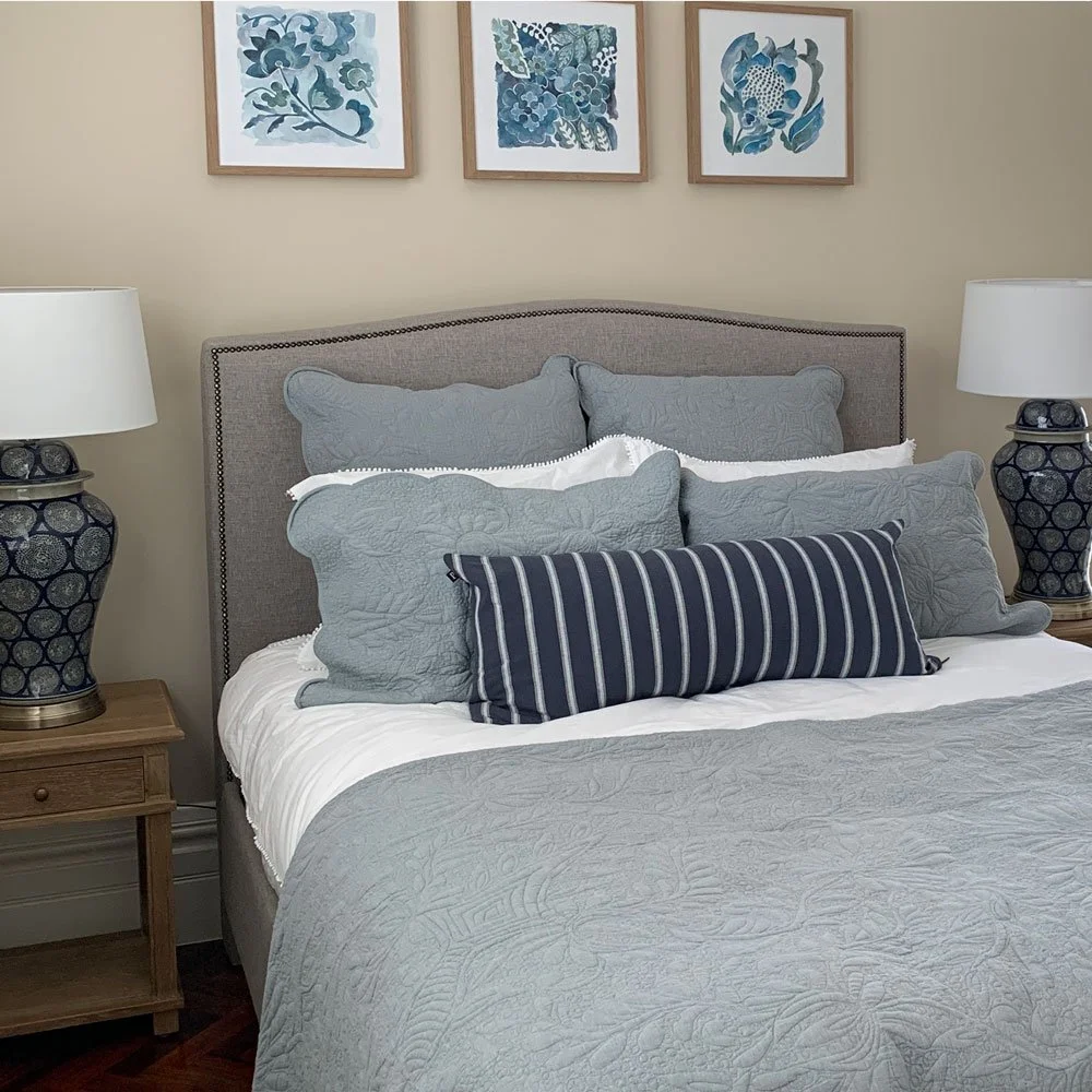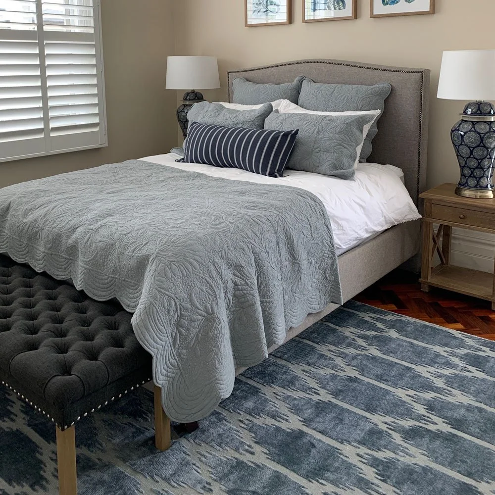 The Brief: Give me a French Provincial bedroom in blues and greens. We couldn’t change the paint colour, so we decorated by adding lighting, mirror, artwork, the dressing table and chair, the occasional chair, bedside tables and a new rug.