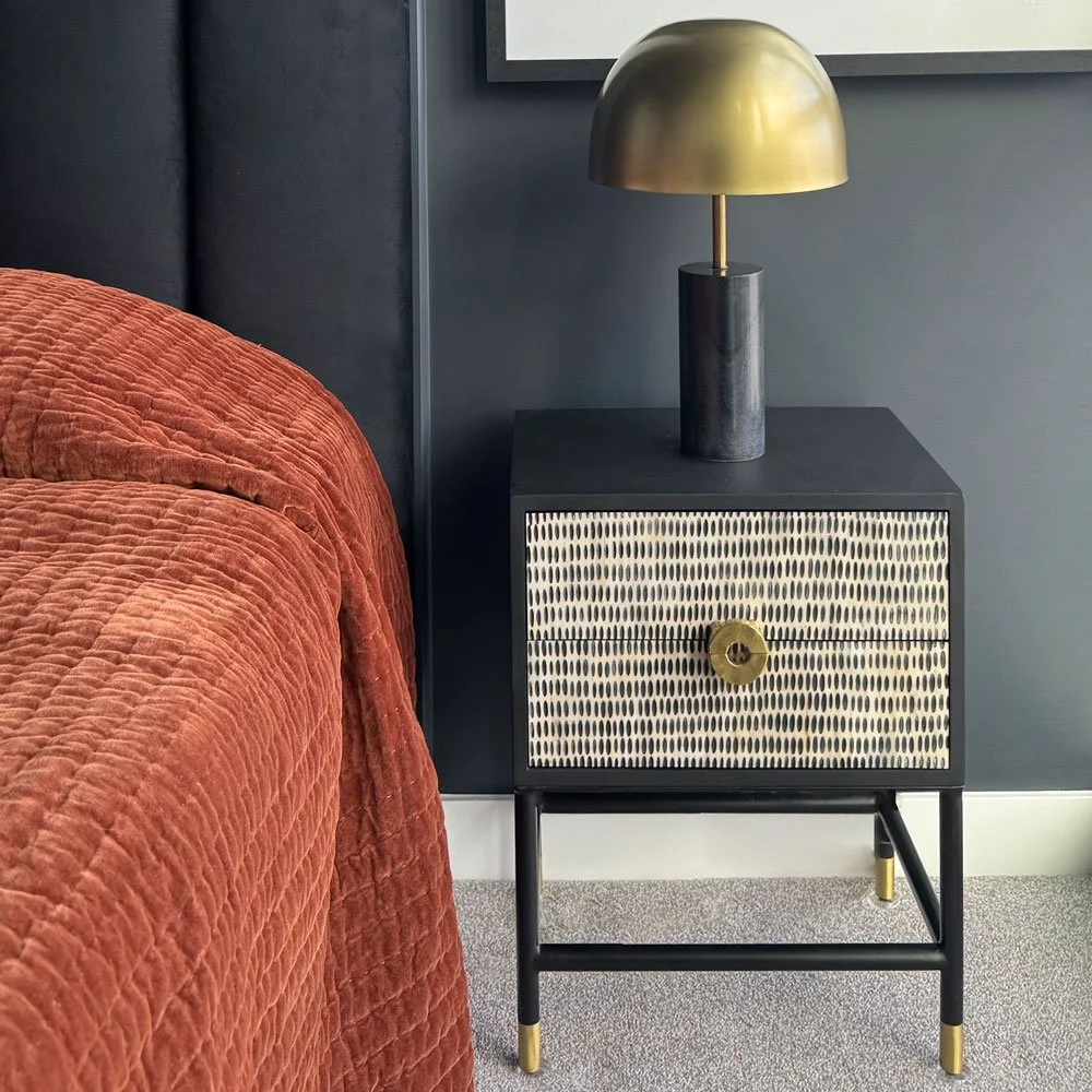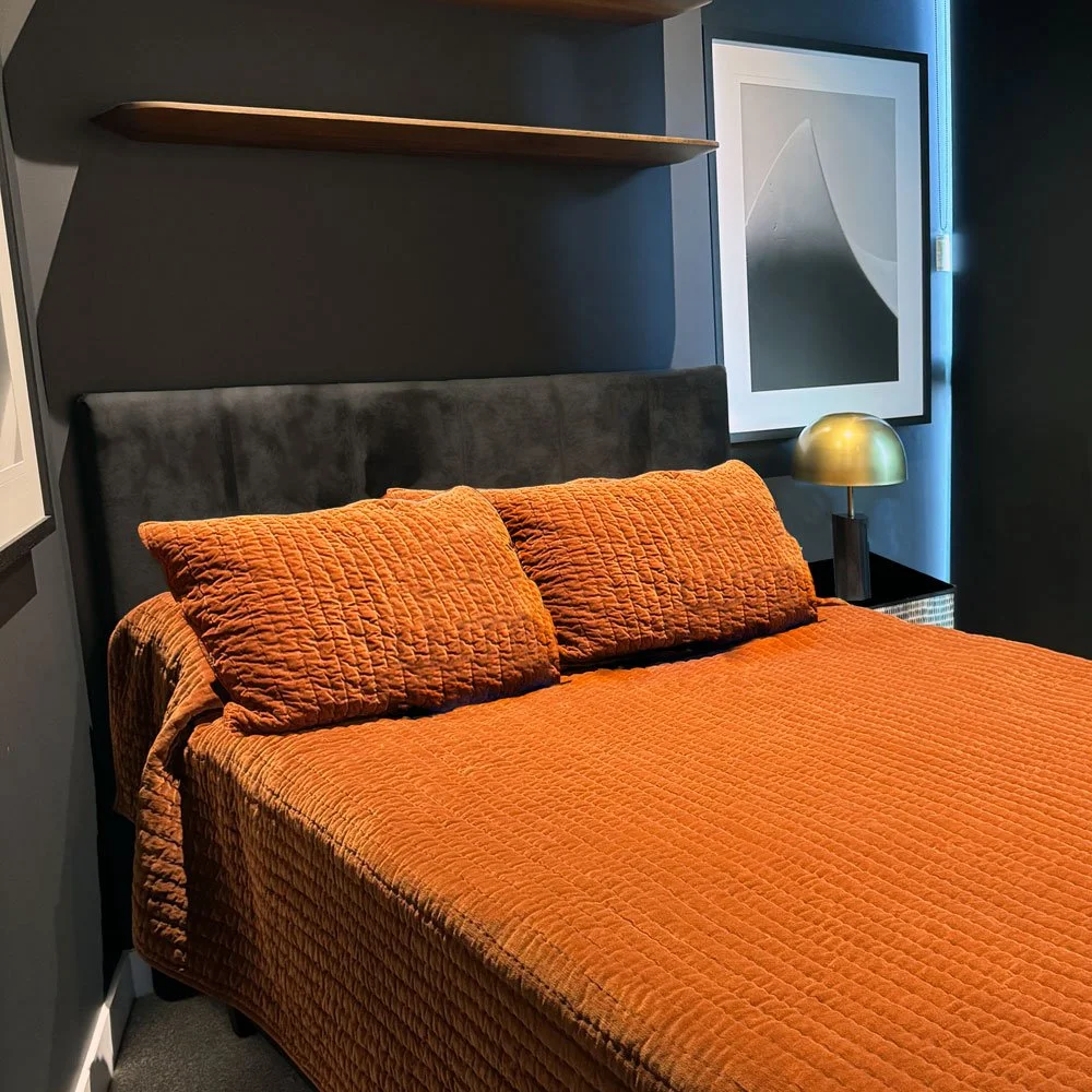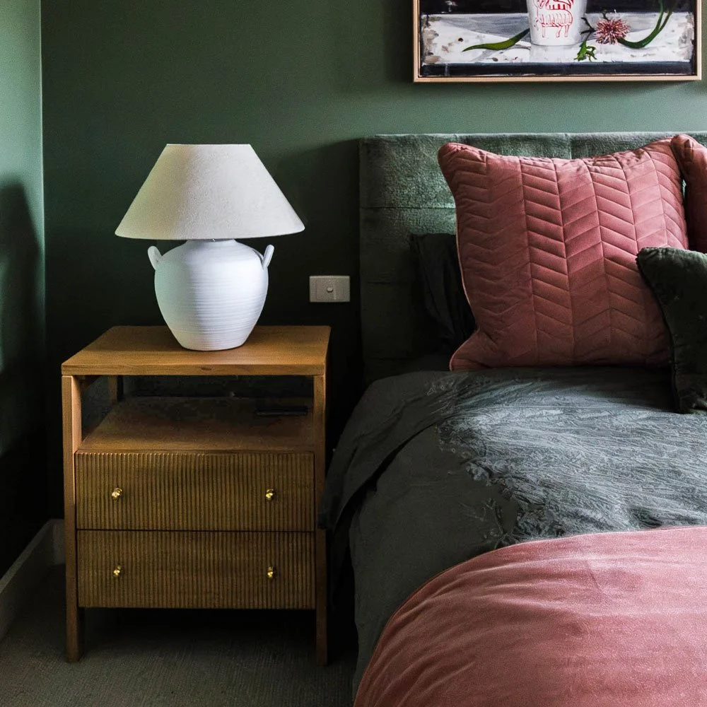 The brief: We want a bedroom that feels bold but still comfortable to sleep in. We ask for dark walls, rich bedding, a stylish bedside table and lamp to make it feel warm, modern and a bit special.